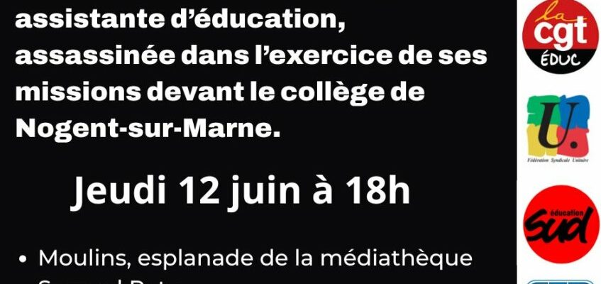 Les organisations syndicales de l’enseignement public CGT, CFDT, FSU, Solidaires, UNSA, de l’Allier invitent les personnels de l’enseignement et les citoyennes et citoyens à se retrouver à 18 h jeudi 12 juin, pour un temps d’hommage à notre collègue Assistante d’Education, Mélanie Grapinet, assassinée dans l’exercice de ses missions devant le collège de Nogent où elle travaillait :